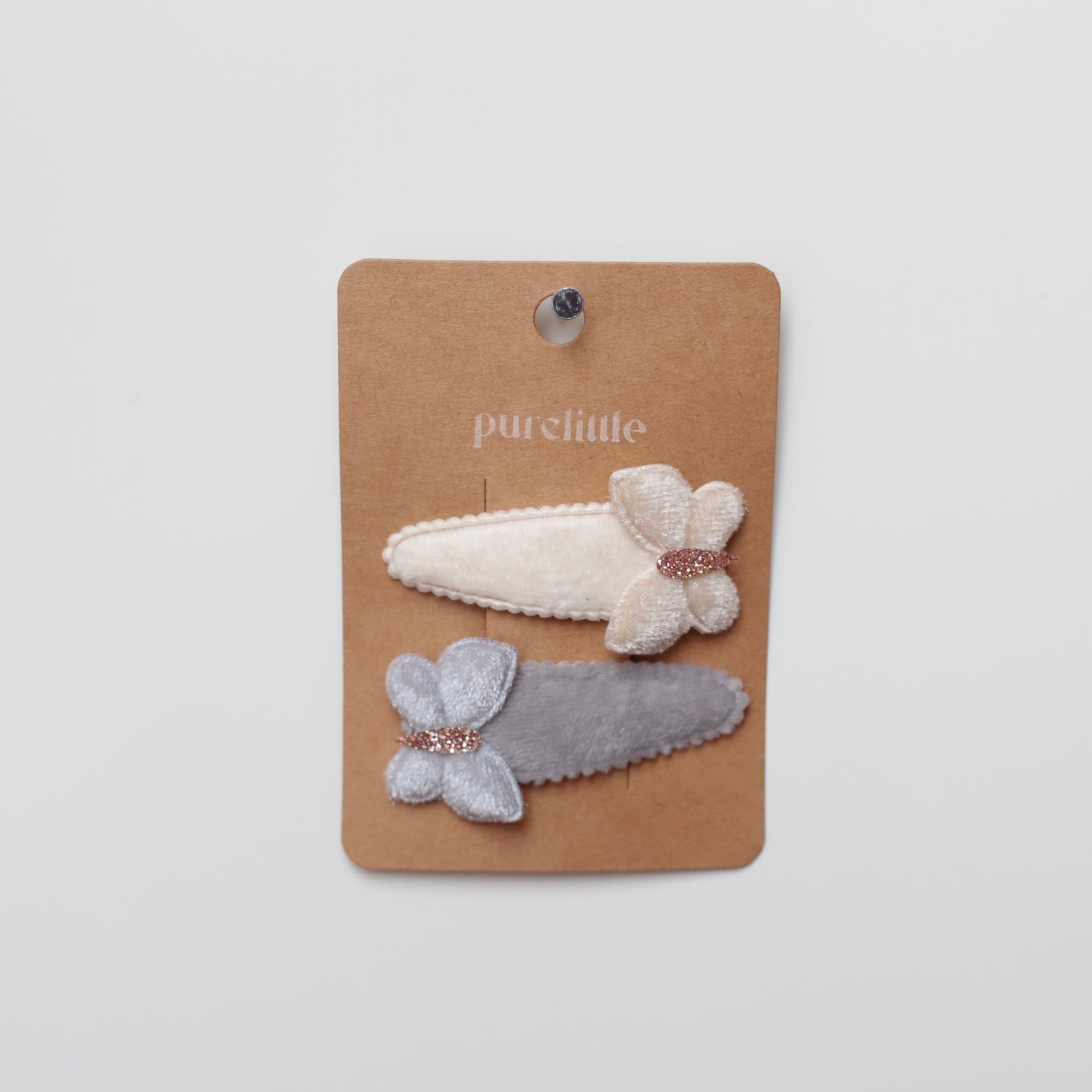 Haarspangen Set aus Clic-Clac-Clips mit weichem Samtüberzug und Samt-Schmetterlings-Applikation.