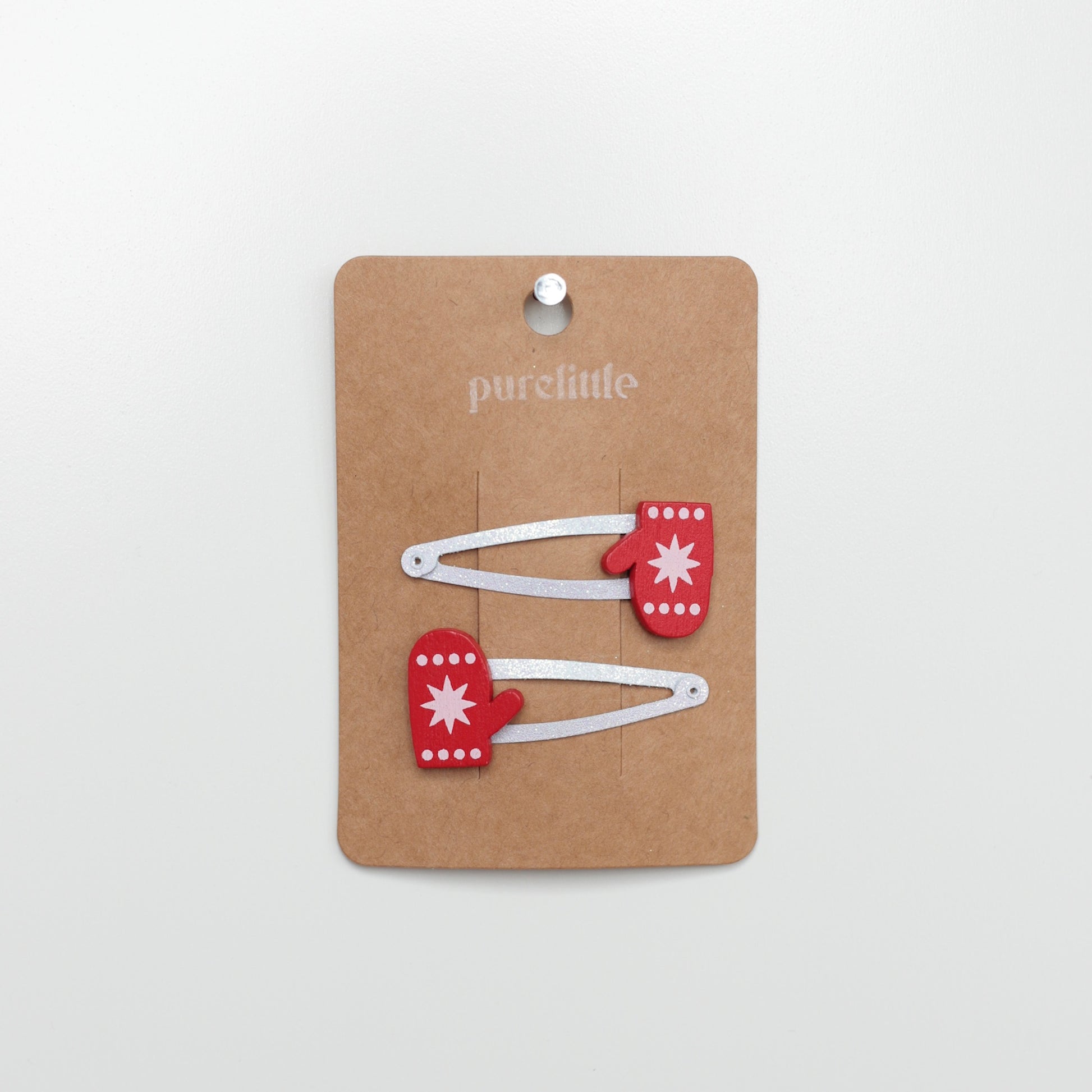 Haarspangen Set aus glitzernden Clic-Clac-Clips mit Handschuh-Applikation aus Holz.