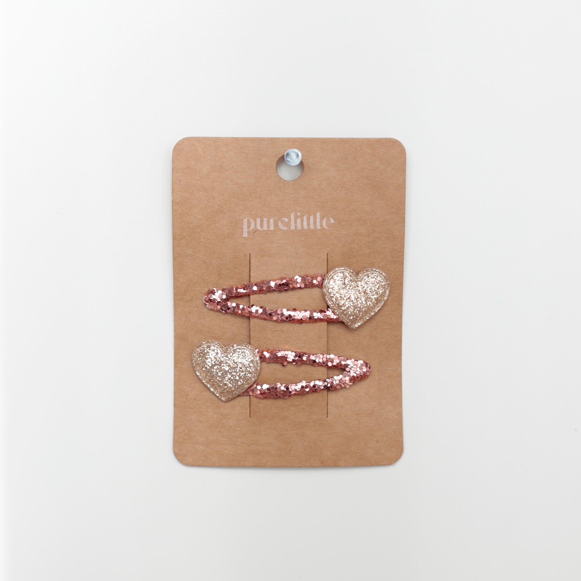 Haarspangen Set aus glitzernden Clic-Clac-Clips mit glitzernder Herz-Applikation.