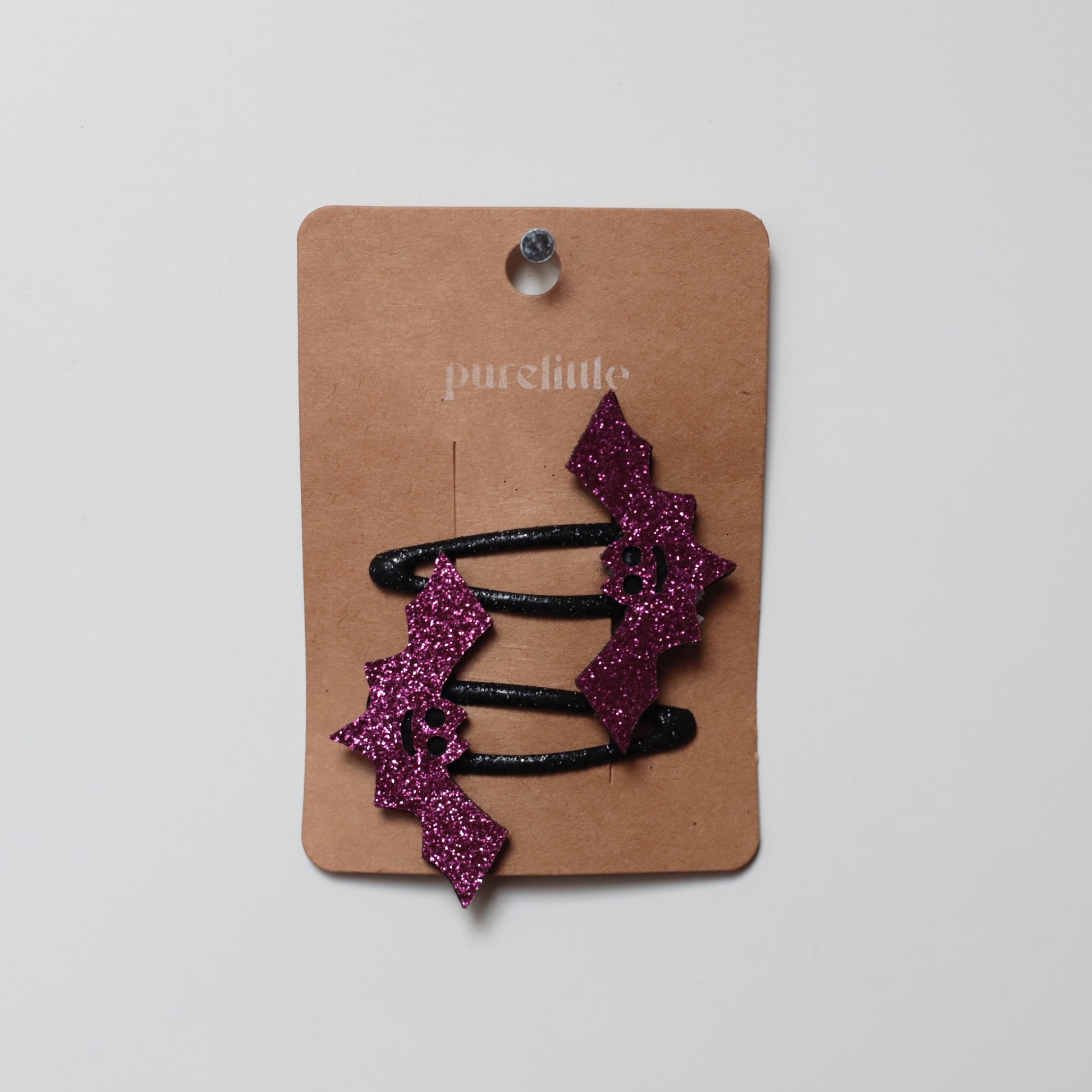 Haarspangen Set aus glitzernden Clic-Clac-Clips mit Glitzer-Fledermaus-Applikation.